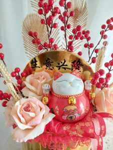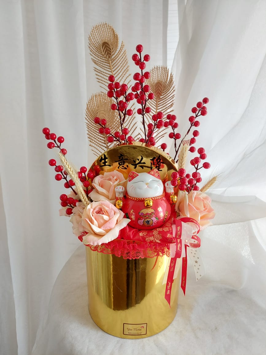 Artificial flowers arrangement in golden box design with fortune cat.