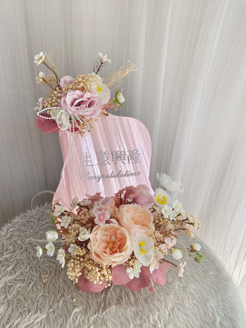 Rose gold mirror design with artificial flowers and dry fillers.