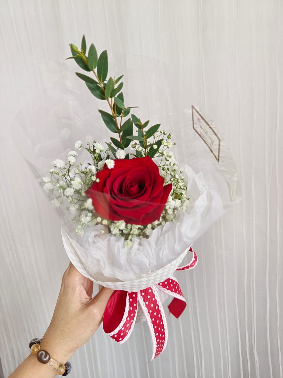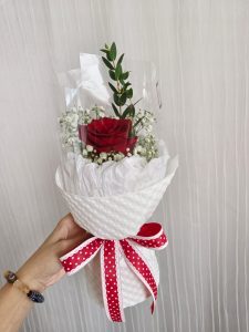 Single stalk red rose with filers.