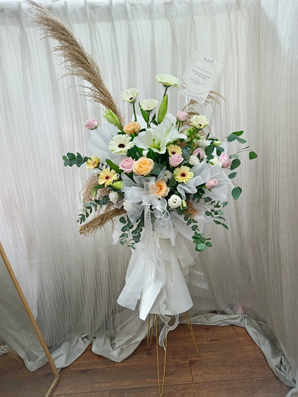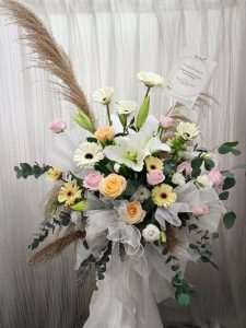 Golden Stand of fresh flowers arrangement. Flowers will be differentiate based on ready stock item.