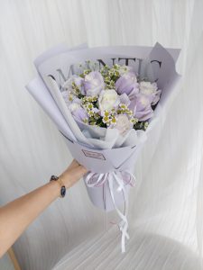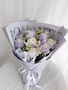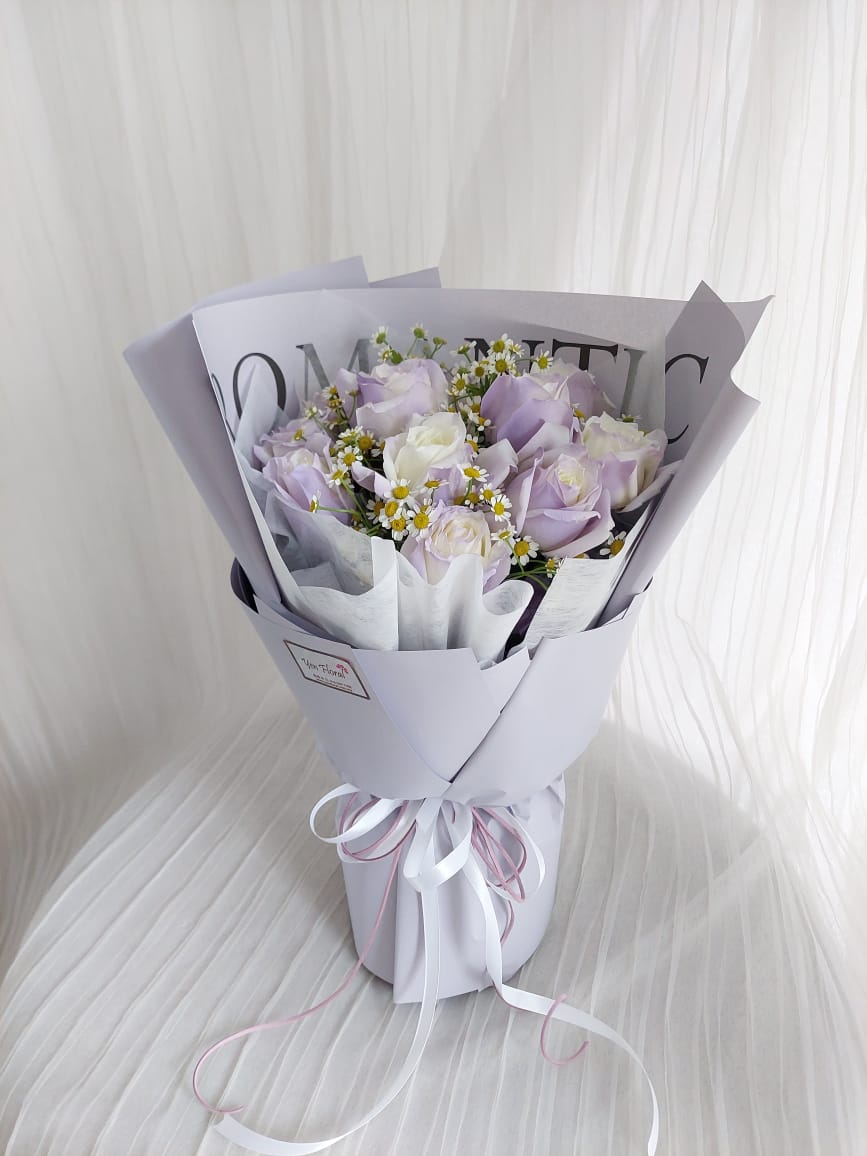 9 stalks white in purple rose with chamomile.