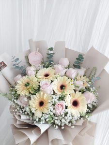 11 stalk avalanche pink and 6 stalks cream daisy.